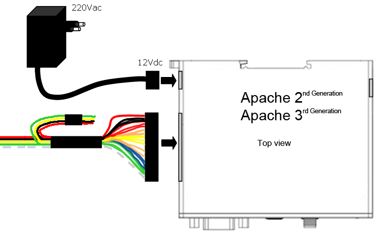 The power supply for the Apache must be at least 12V Dc and a maximum of 24V Dc. The use of a fuse in the Apache is advised if you are using vehicles with 24V charge, such as lorries. The power supply must correspond to en60950 guidelines.