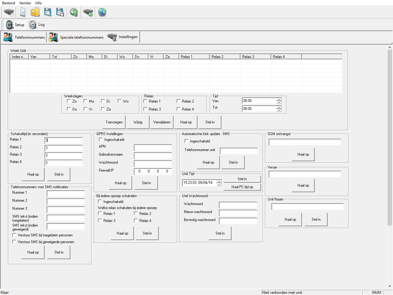 - LET OP: rechts onderin het scherm wordt de verbindingstatus weergegeven: Verbonden met unit of Niet verbonden met unit.